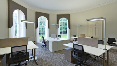 The significant refurbishment and redesign of Milton Hall, by Milton Hall Estates, was a privately funded venture by its owners to reinvigorate the very tired and outdated office space. The brief was to take the Grade 2 Listed Georgian Hall and produce high-end serviced office accommodation. It needed to be designed to attract small to medium-sized companies keen to have an ‘office with character’ in the Cambridge area. Upon first viewing, the buildings were ‘rabbit warren’ like and as such the most significant task was to create clear and visible access for all users. This needed to be done while respecting the remaining heritage of the Hall and keeping close scrutiny on the budget. The main aim of the interior design was to build on the high level of expectation experienced outside the building, showcasing the historical fabric where possible. The design therefore uses the inherent beauty of Georgian architecture as inspiration while introducing contemporary modernisation where necessary.