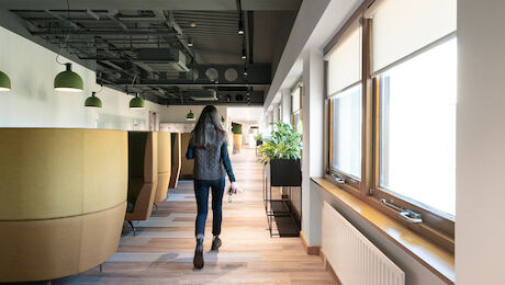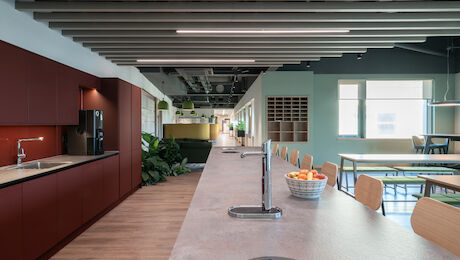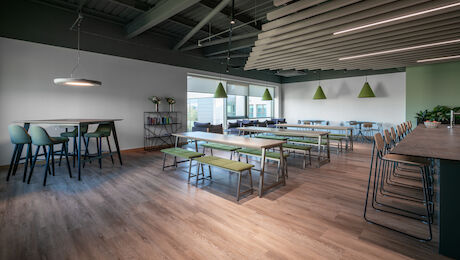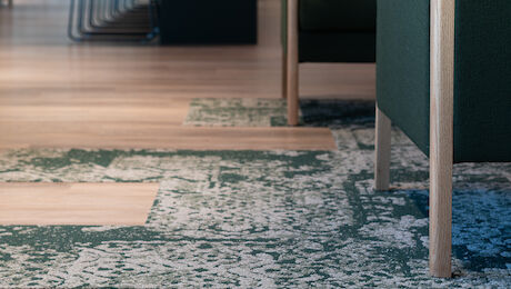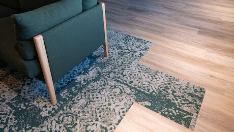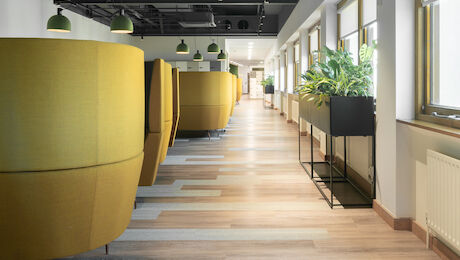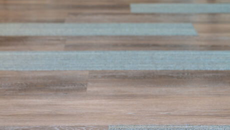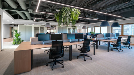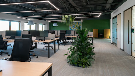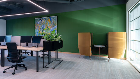The concept for the design included exposed ceilings with suspended lighting, acoustic rafts and hanging planters and a soft mix of vinyl and carpet planks with recessed planters.