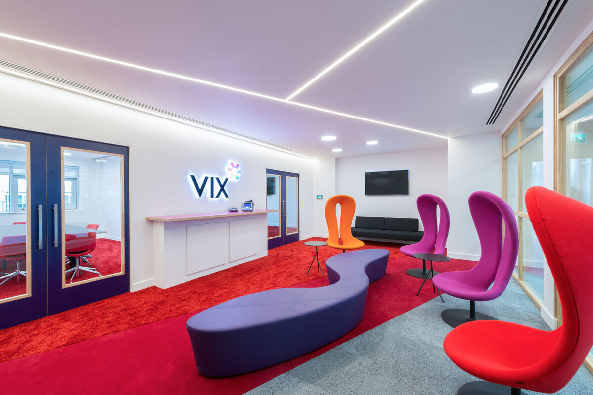 Vix initially employed us to provide a design and budgeting service for their Head Office relocation in Cambridge. The brief was to create an exciting, vibrant and ‘on brand’ interior showcasing product development and corporate values. Once the design phase was underway we were also engaged as Project Managers to support the Vix project team. The office areas were specified to allow flexibility while supporting collaboration. A clear desk policy is in place with storage returns ensuring clutter remains out of sight, write-on walls have been included wherever possible to inspire discussion and informal meeting areas have been carefully located to support the open plan. Existing services, carpets, ceilings and lighting have been enhanced to create the design, and a challenging program was achieved including a two-phase installation with occupation of the the first phase prior to completion of the second.